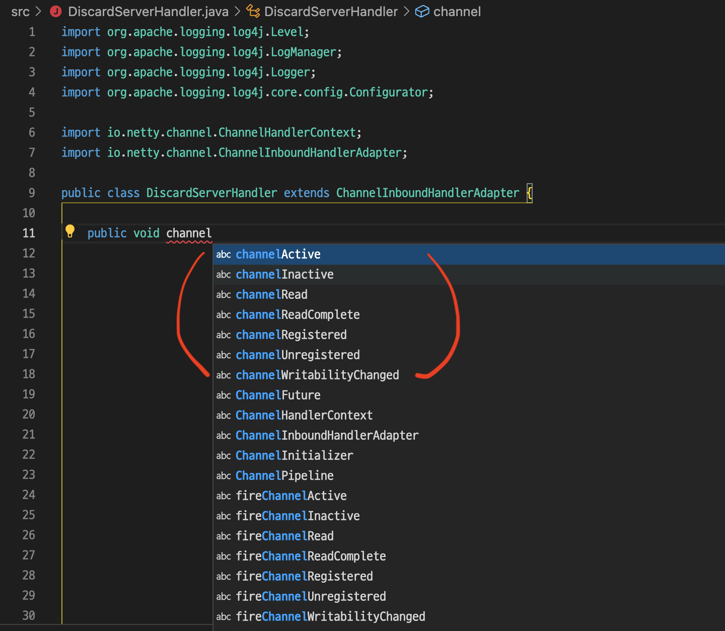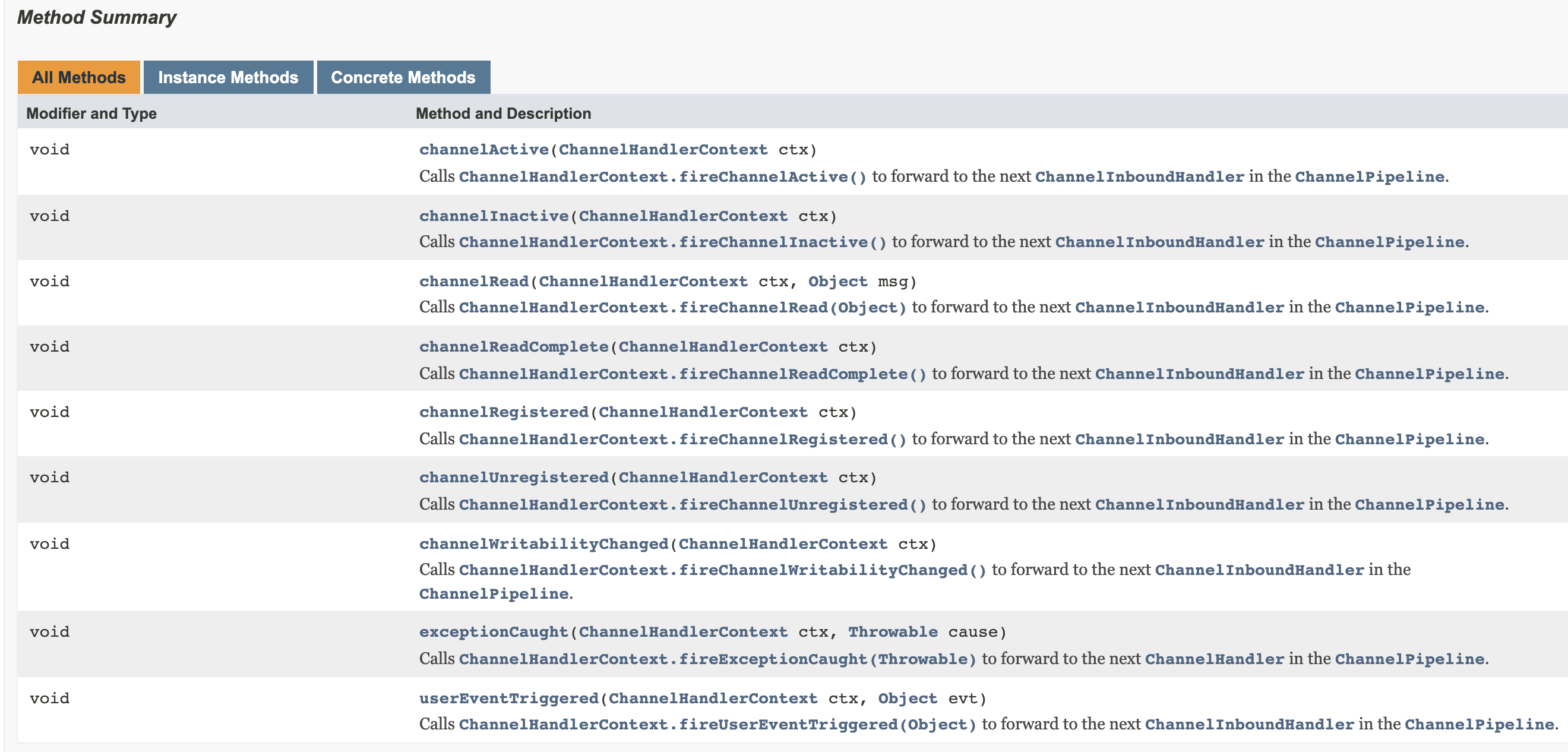 여기서 보면 이벤트들이 보인다. 해당 Method에는 전부 ChannelHandlerContext 와 ChannelRead는 특별하게 Object msg 가 추가로 있다. 뭐 설명 안해도 알겠지만 여기에 받은 메시지가 있겠지?