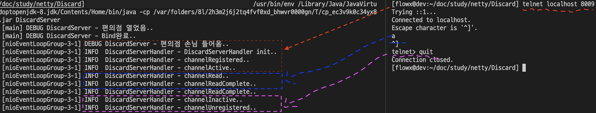 하단 코드에서 p.addLast(new DiscardServerHandler()); 를 추가해서 손님이 들어왔을때 어떻게 할지 처리를 하는걸