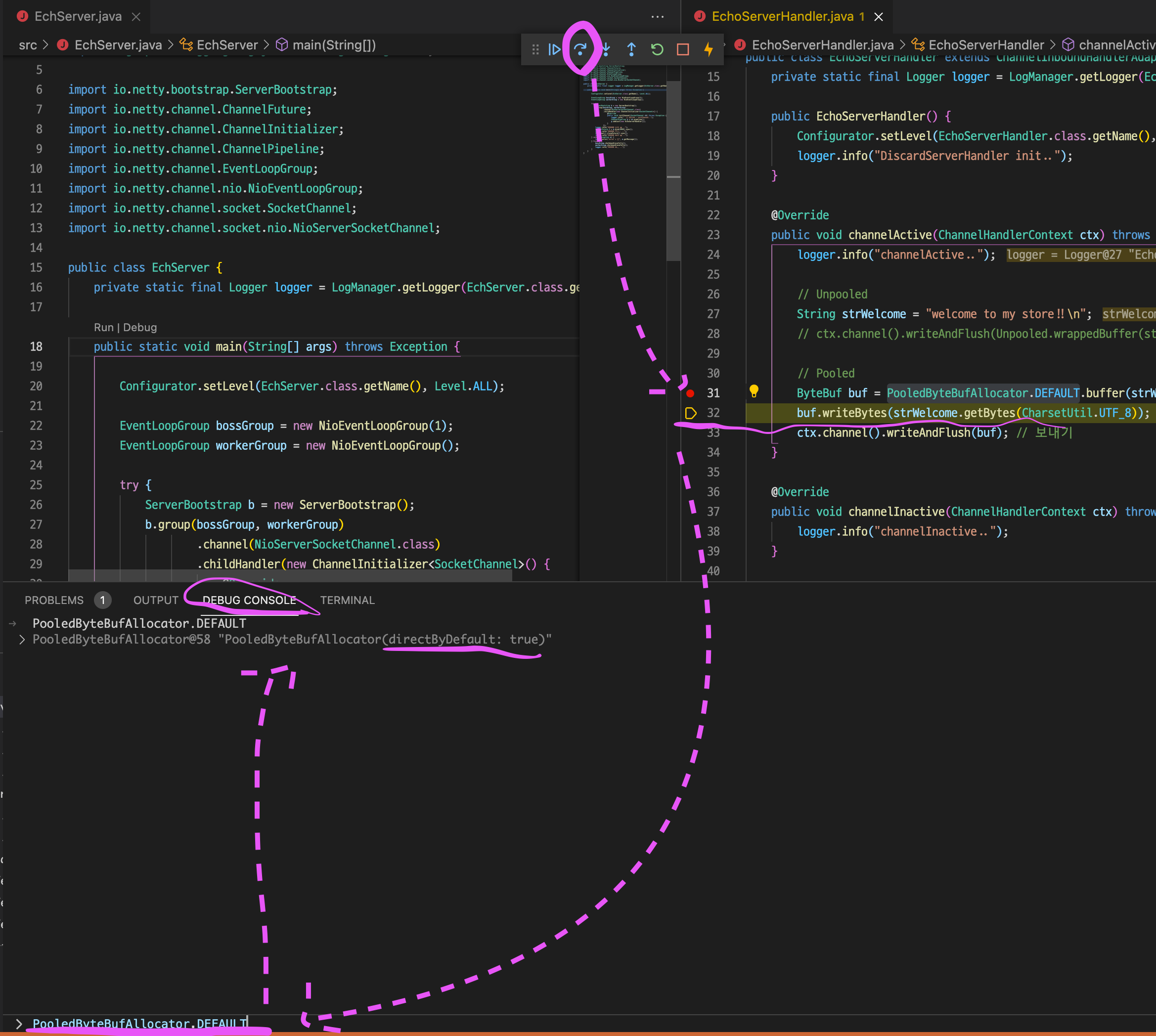 5) 그리고 vscode 하단에 DEBUG CONSOLE 탭 누르고 밑에 입력값에 PooledByteBufAllocator.DEFAULT 값 입력 하고 값을보면
