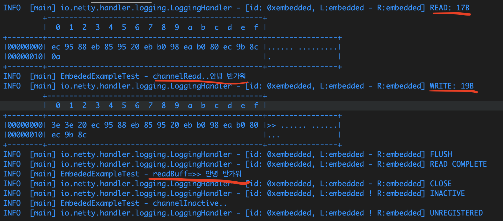 buf.writeBytes("안녕 반가워\n".getBytes());