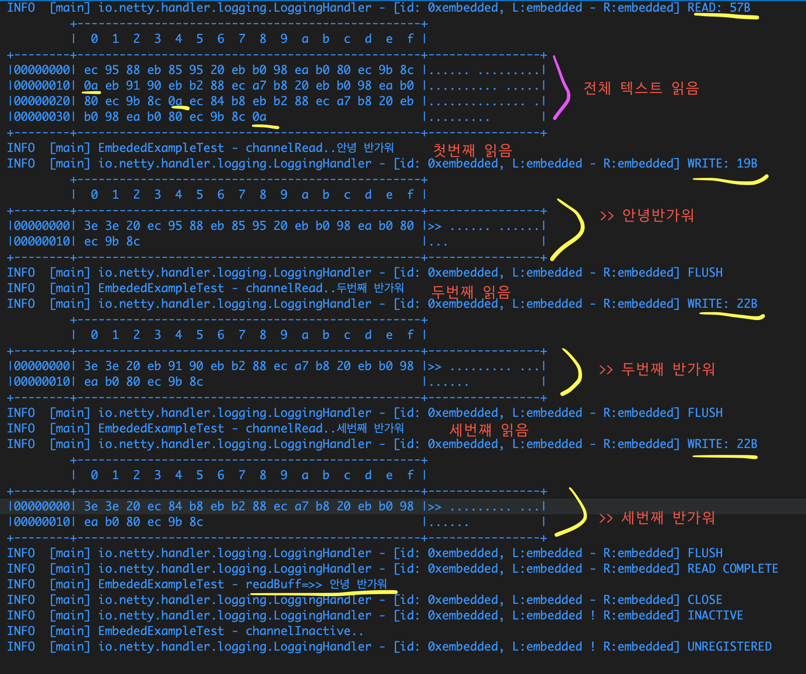 buf.writeBytes("안녕 반가워\n두번째 반가워\n세번째 반가워\n".getBytes()); // 변경 후