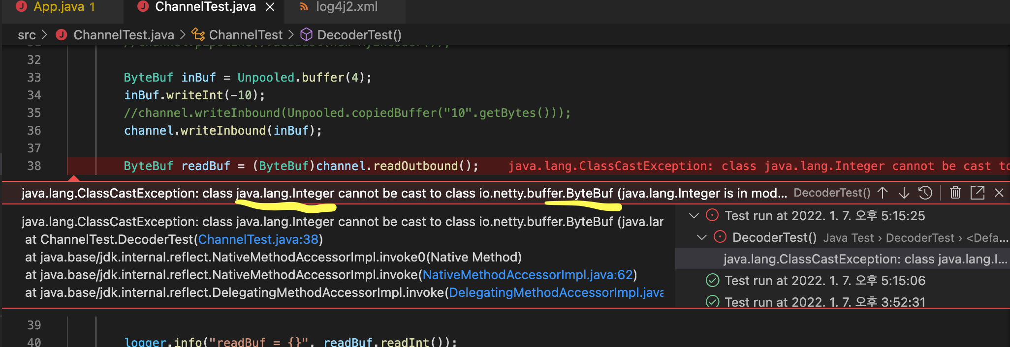 MyChannelHandler에는 MyDecoder에서 전달받은 Integer가 담겨있고 그걸 다시 보냈으니 받을때 오류가 난것이다.