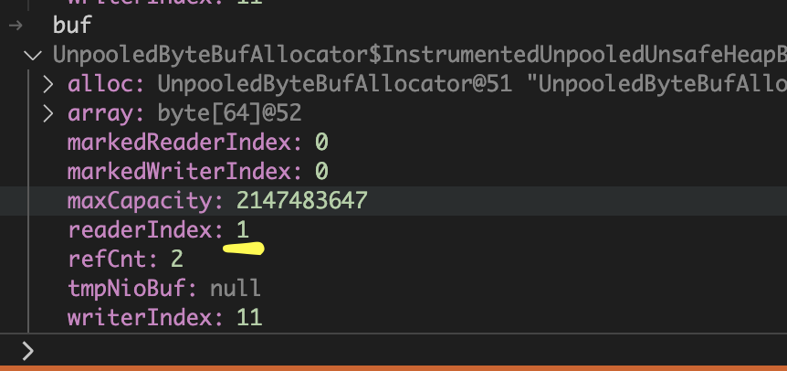 readByte()에서 멈췄으니, readerIndex는 0이고, writeIndex는 11byte로 현재 문자열 끝에 가있다.