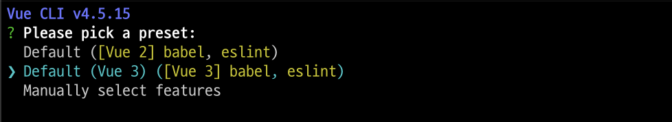 - Vue3 선택하고 엔터 ( 뭔지모르겠지만 최신버전을 해보자. 딴거없고 나는 항상 최신버전을 좋아함.. )