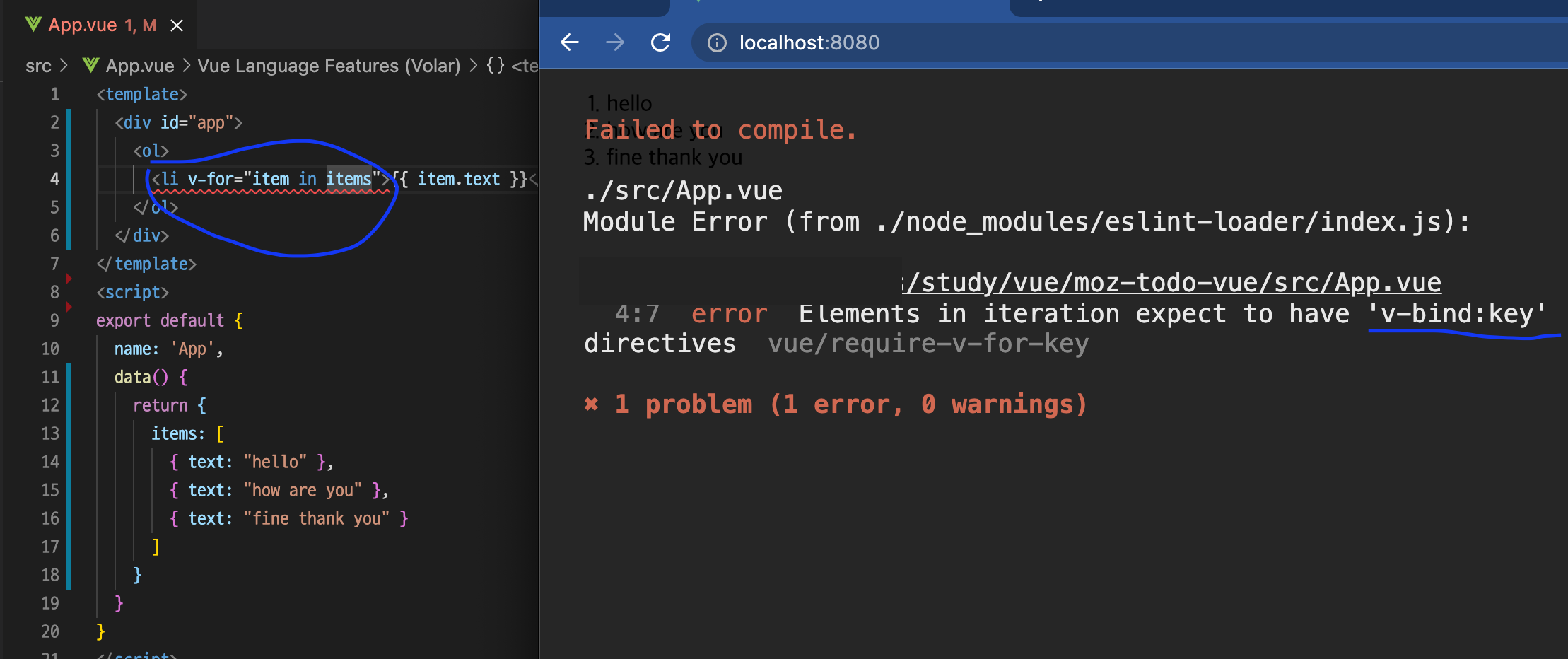 - v-bind:key 속성을 쓰지 않으면 아래처럼 오류가 난다..