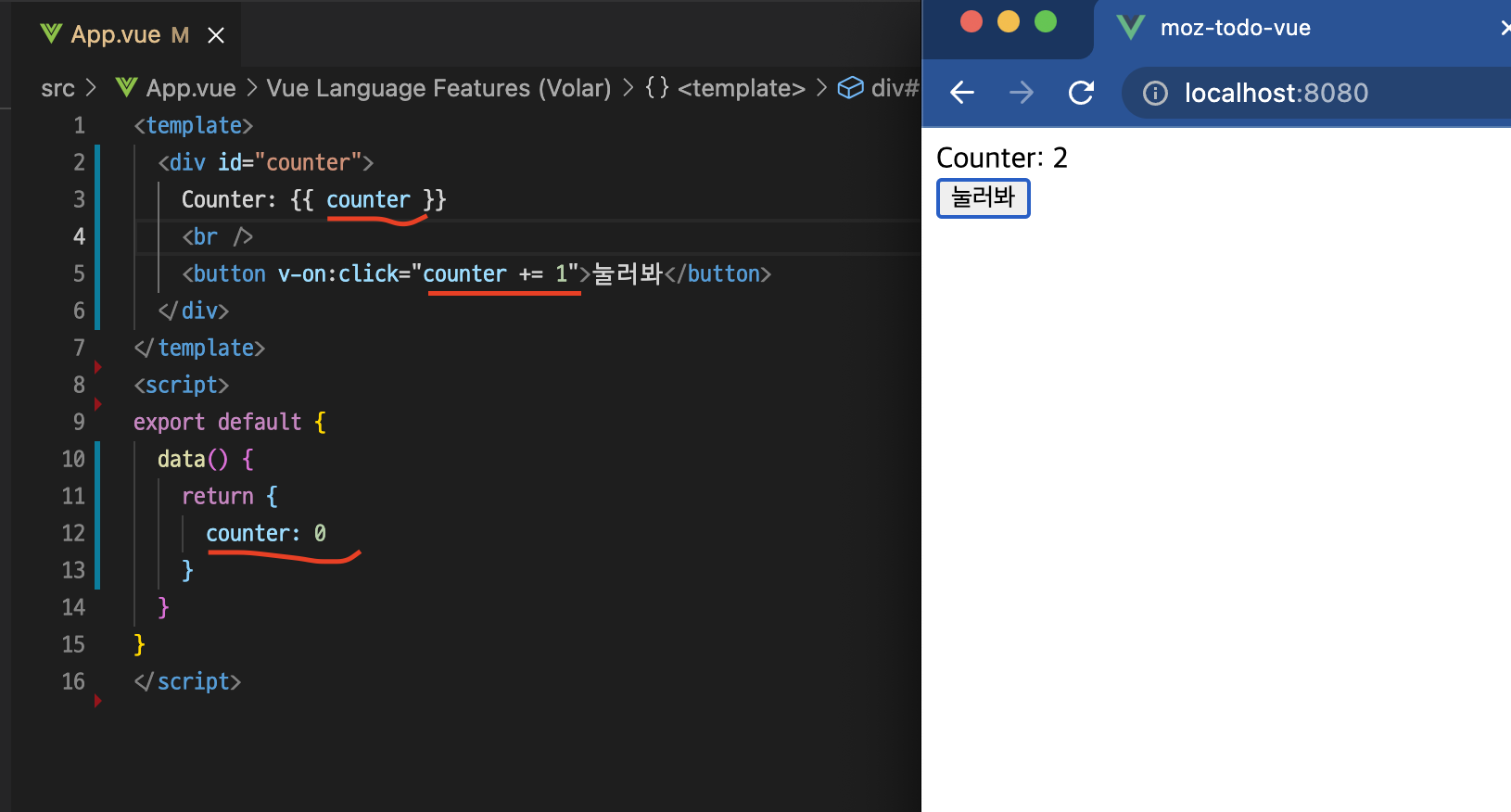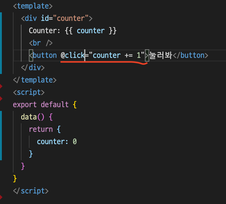 - 버튼을 누르면 +1이 되는걸 만들어보자 (v-on:click="함수")
