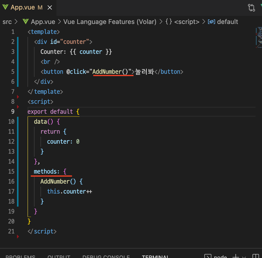 script 블럭에서는 methods 를 쓰고 그안에 함수들을 기술한다